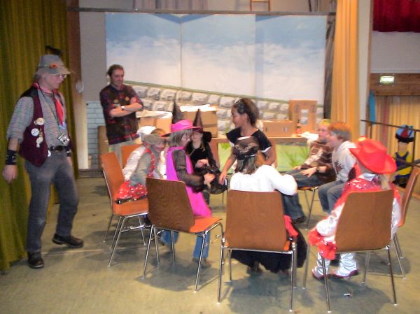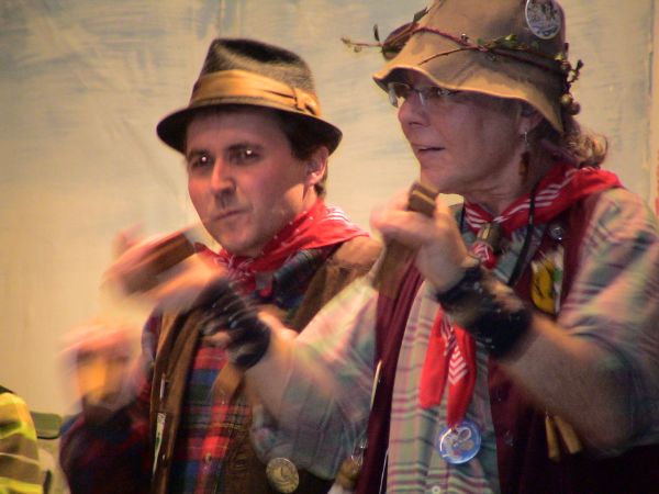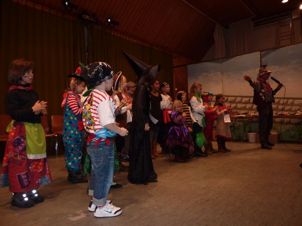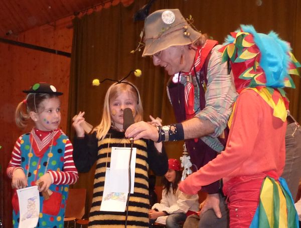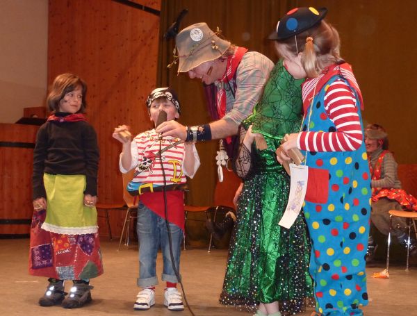 Zuerst kleppert man mal gemeinsam ein paar Fasnetsprüchle, zur Beruhigung, und dann teilt Ansager Rainer die Teilnehmer in "Kleine" und "Große" ein.