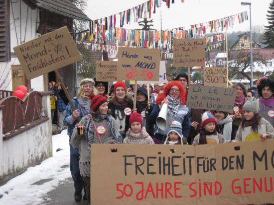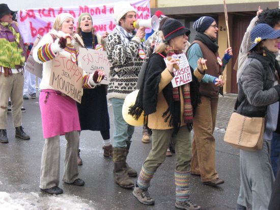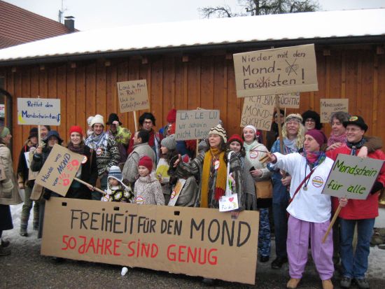 Im Ausstellungsgebiet, kurz vor dem Umzug: Die Klepperle sind als Anti-Moofanger-Demonstranten da, und haben sich zum Erinnerungsbild aufgebaut.