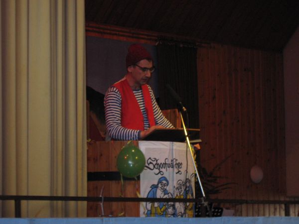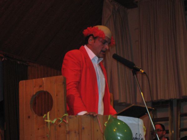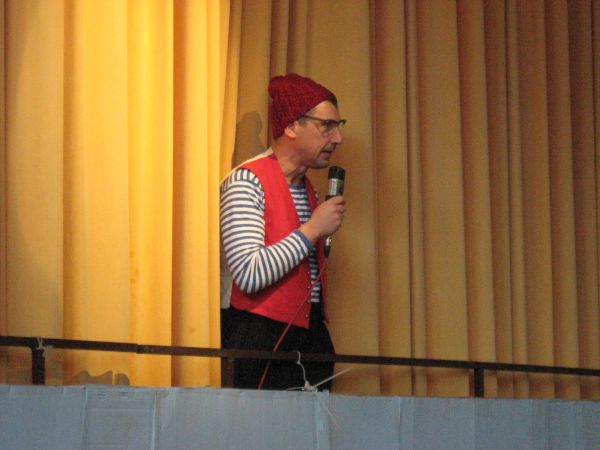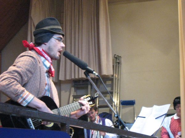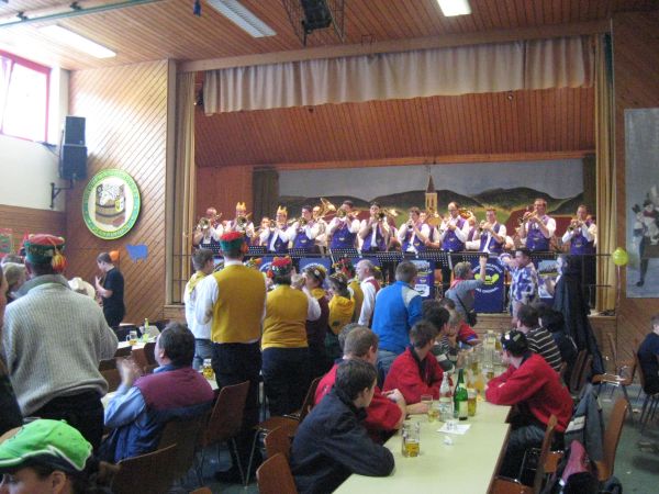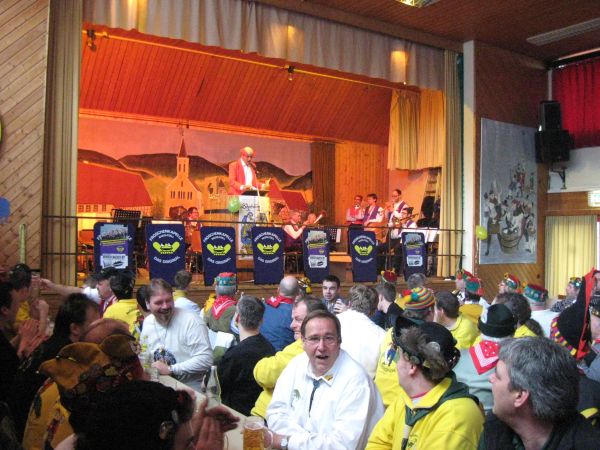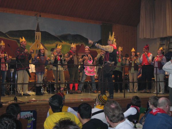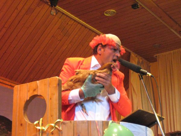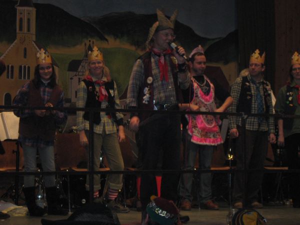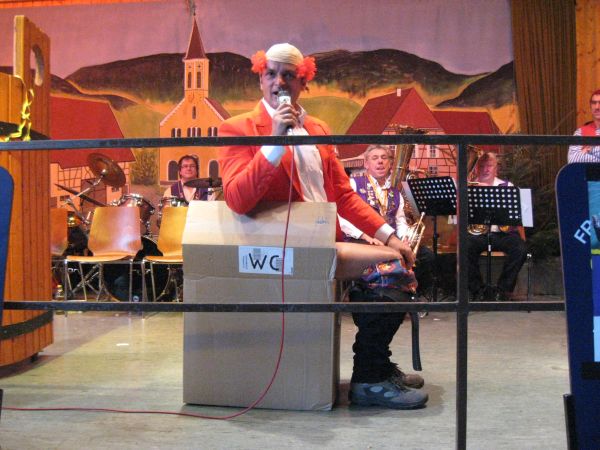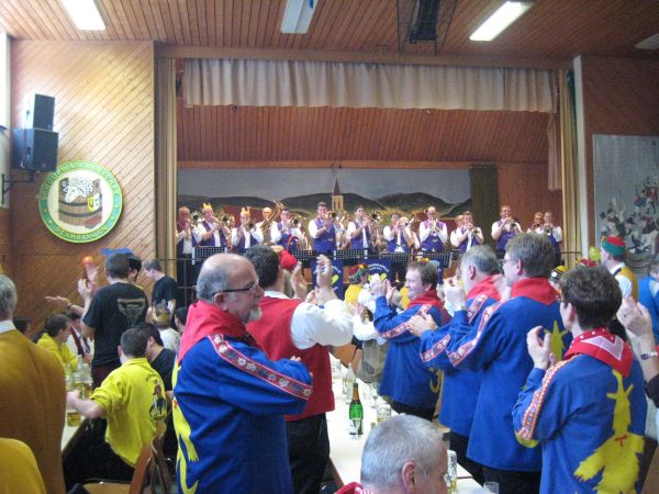 Er wird dabei auch spontan von einigen Musikern unterstützt und die Narren singen begeistert "Ich wollt ich wär ein Huhn" und andere Gassenhauer mit.