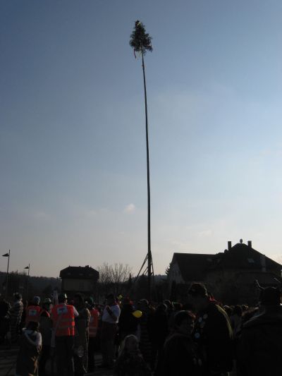 Während von den Holzern der Narrenbaum langsam höher gestemmt wird, ...