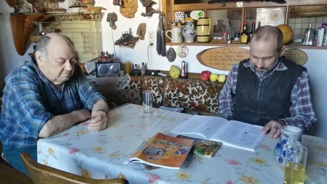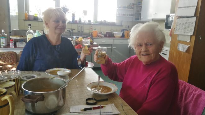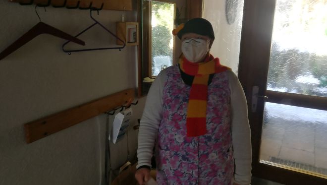 Hier ist Jane bei der ursprünglichen Besitzerin von ihrem "Kleiderschurz". Die 90-jährige Elly Zimmermann erkennt ihren Schurz, aber nicht die Trägerin, die ihr Tanten-Kind ist.