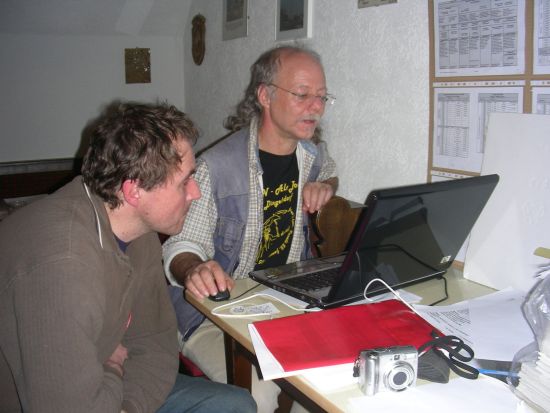 00.14 Uhr: Chef Rainer ist an der traditionell letzten Arbeit: "Narrenfahrplan und Impressum". Ralf berät ihn dabei.