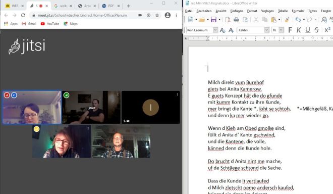 Alle zwei Stunden schaltet man sich zu einer kleinen Gesprächsrunde zusammen und bespricht Zwischenergebnisse. Und Schpässle werred au gmacht!