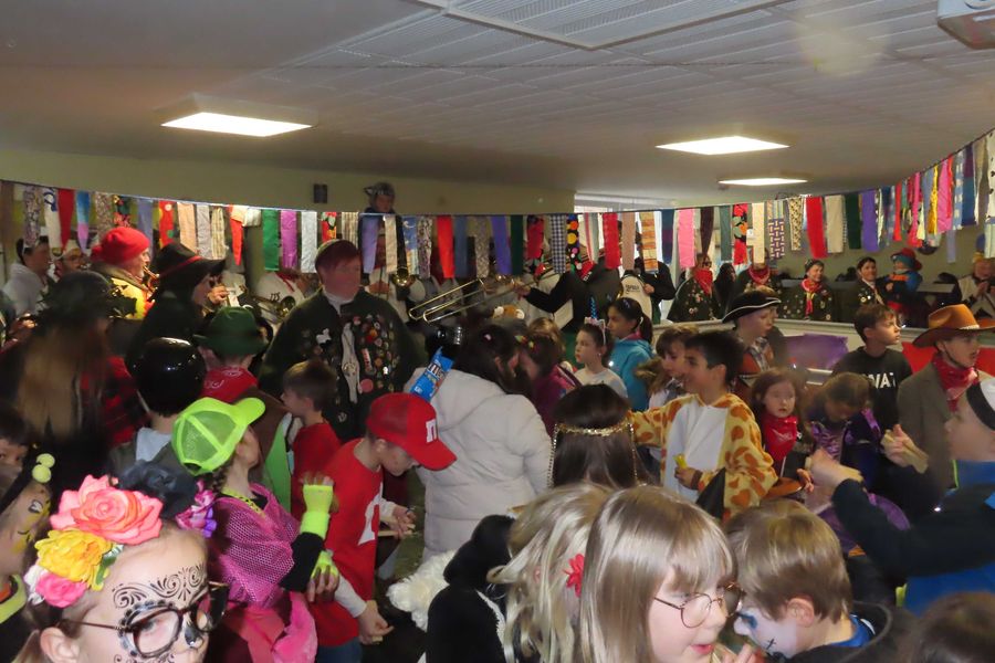 Die übrige Narrenschar auf dem Weg in Richtung Schule.