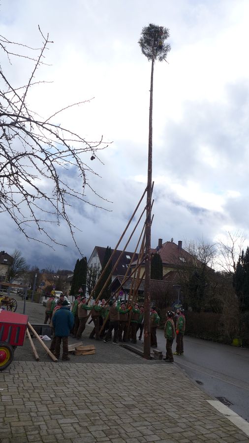 Dann machen sich die Holzer daran, mit starker Manneskraft den Narrenbaum aufzurichten.