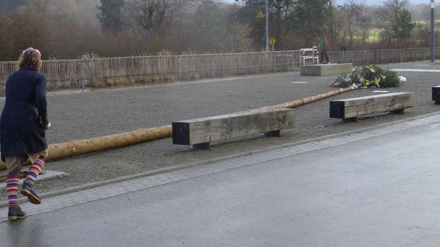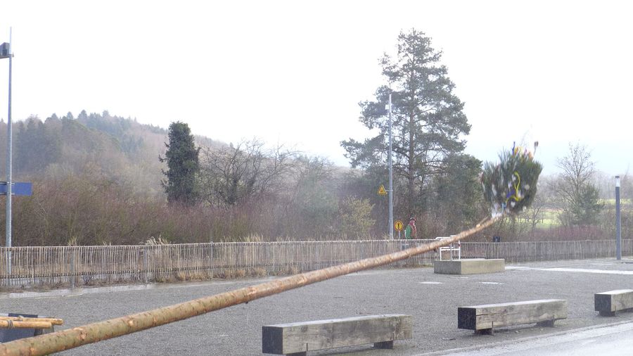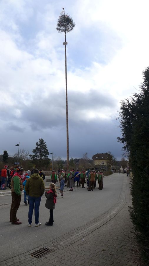 Gegen zwei trifft man sich am Narrenbaum, der sich hier noch stolz in den bewölkten Himmel reckt.