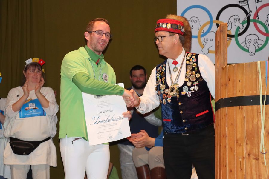 … bekam zum Schluss unser Kassier Jan Dietrich. Neben dem „normalen“ Verdienstorden erhielt er den „Dackel-Orden“ für mindestens 15-jährige Tätigkeit in der engeren Vorstandschaft. Das ist wahrlich eine „Goldmedaille“, die nicht jeder erringt.